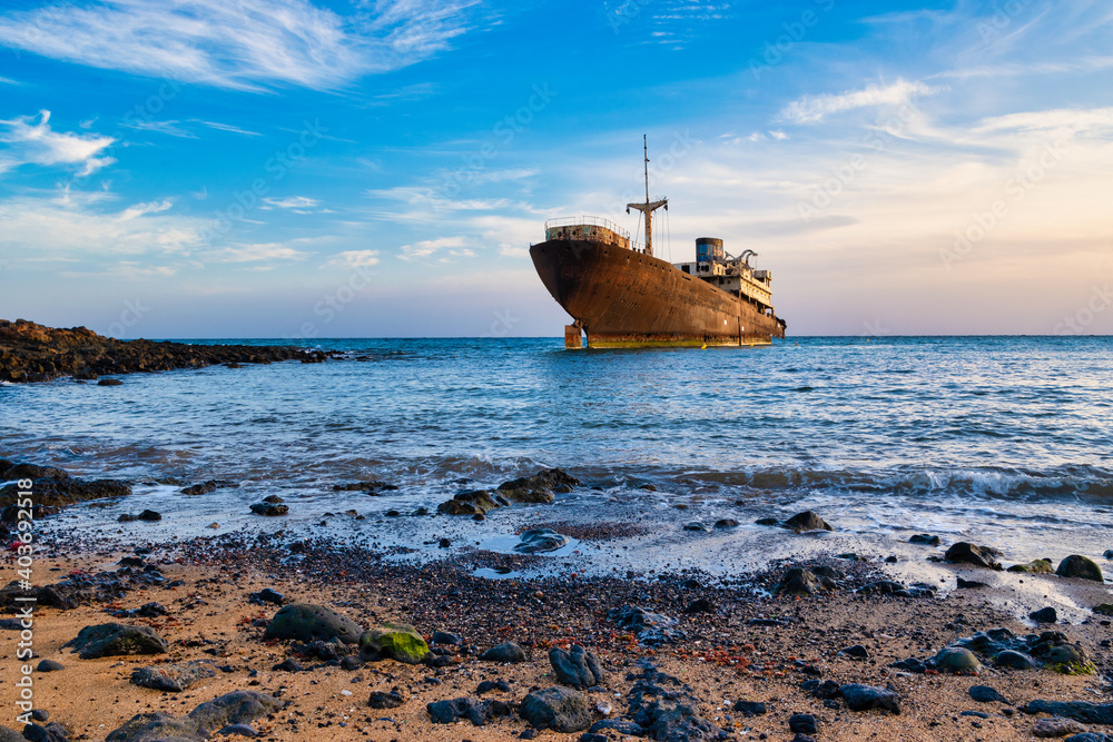 Fototapeta Old wrecked ship in blue ocean, in the town of Arrecife on the island of Lanzaro