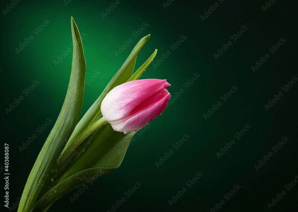 Fototapeta tulip with water drops on dark green background