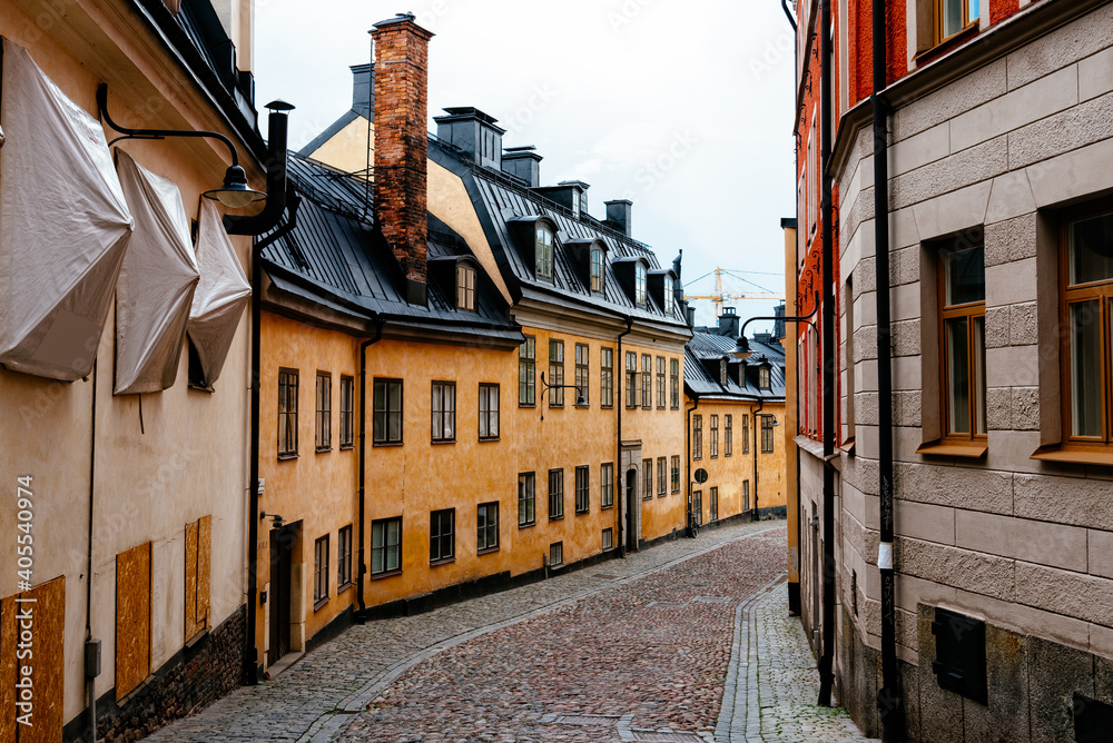 Fototapeta Picturesque cobblestoned street with colorful houses in Ugglan quarter in Soderm