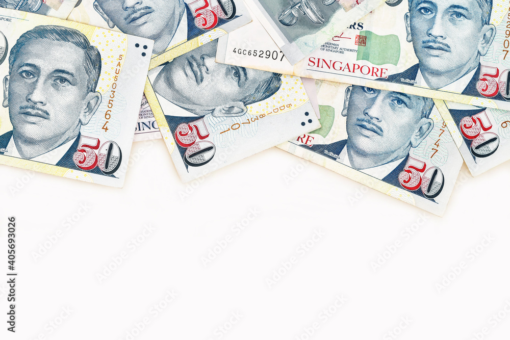 Fototapeta Close up of fifty singapore dollar on many singapore money background