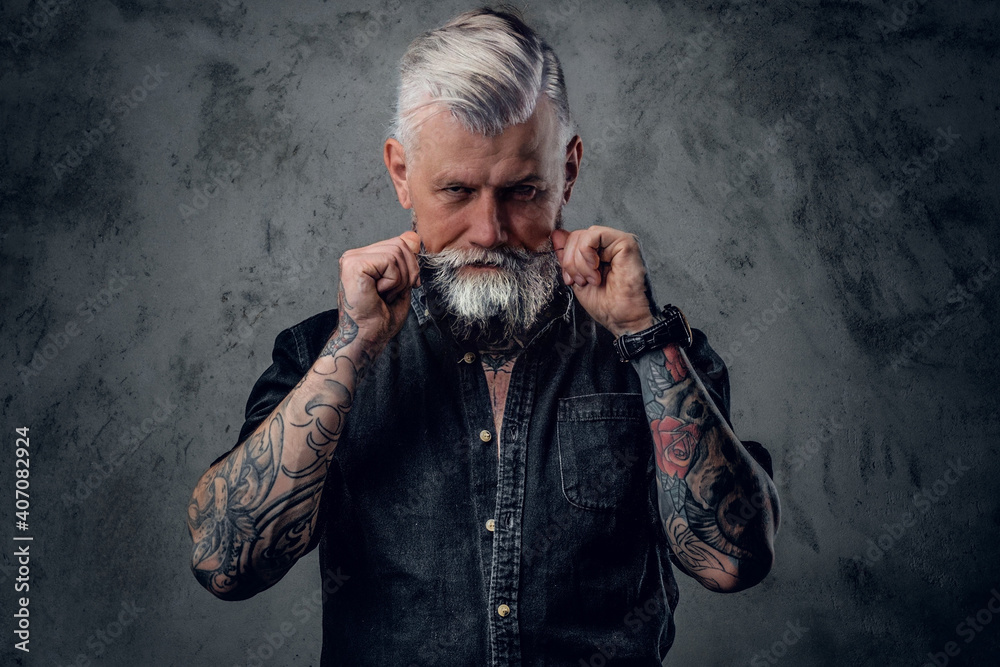 Fototapeta Portrait of old and confident man with tattooed body and gray hairs which poses in dark background