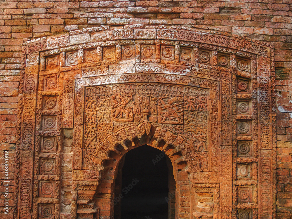 Fototapeta Beautiful carved terracotta with Ramayana battle scene on entrance porch of Chot