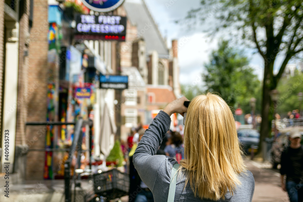 Fototapeta Young woman takes pictures in vacation spent in Amsterdam with beautiful architecture and coffee shop