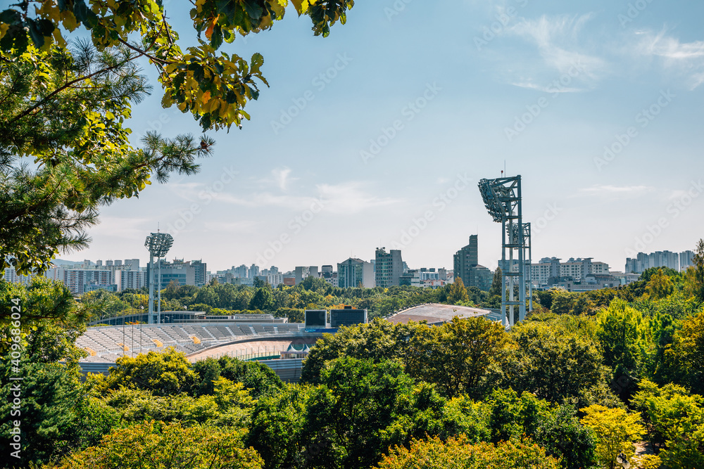 Fototapeta Olympic park green forest and cityscape in Seoul, Korea