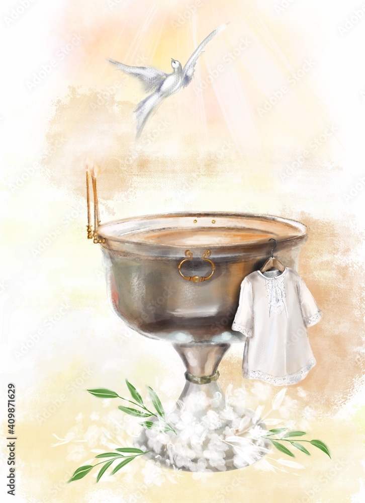 Fototapeta illustration a metal font in a church for the baptism of children and a white baptismal shirt