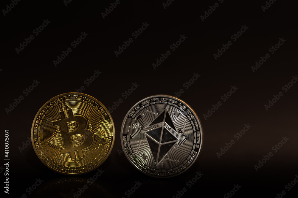 Fototapeta single bitcoin and ether coin on black background bottom