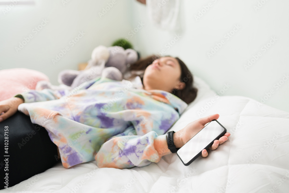 Fototapeta Teenage girl dozing off in bed with a phone on her hand