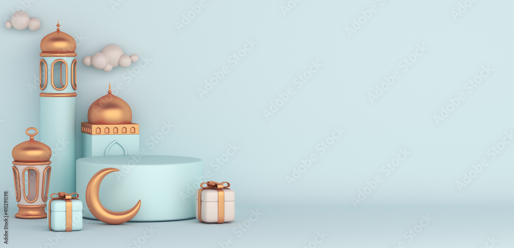 Fototapeta Islamic display podium decoration background with mosque, lantern, crescent cartoon style, ramadan kareem, mawlid, iftar, isra miraj, eid al fitr adha, muharram, copy space text, 3D illustration