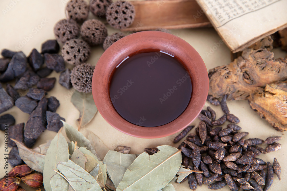 Fototapeta A pile of Chinese herbal medicine and a bowl of Decoction