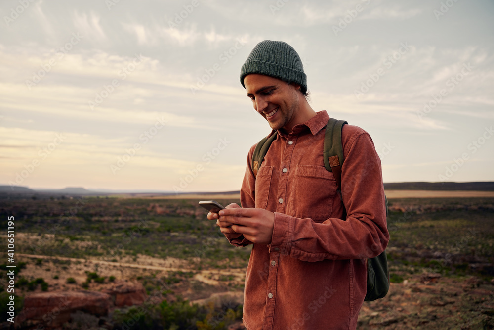 Fototapeta Happy male hiker with backpack and cap using smartphone on mountain