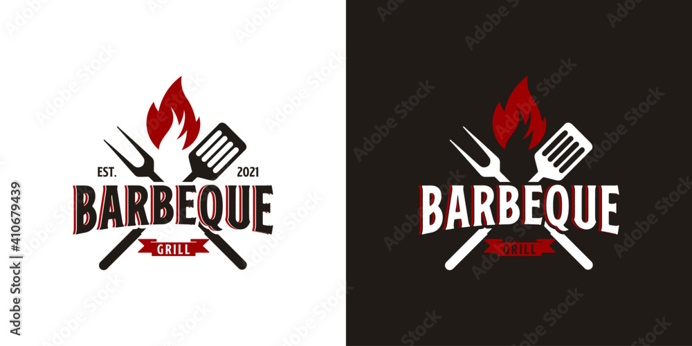Fototapeta barbecue logo with bbq logotype and fire concept in combination with spatula and