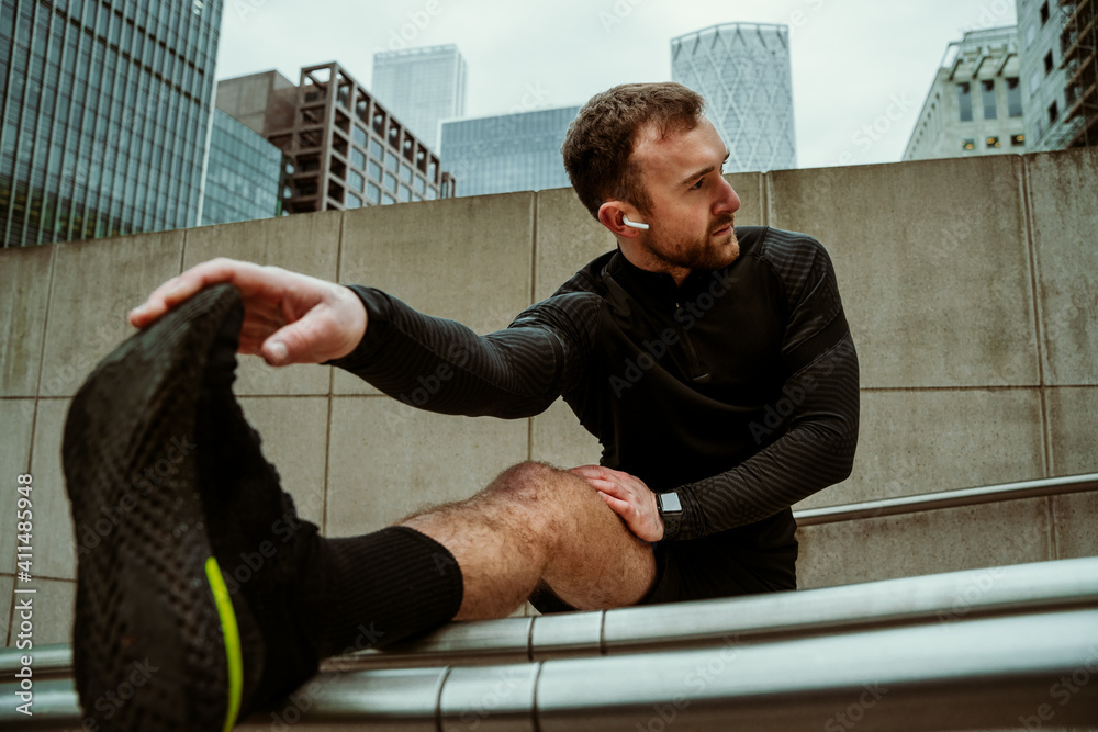 Fototapeta Handsome caucasian male athlete stretching legs running in city exercising for f