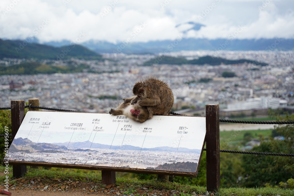 Fototapeta Playful monkeys on handrails in the Arashiyama Monkey Park
