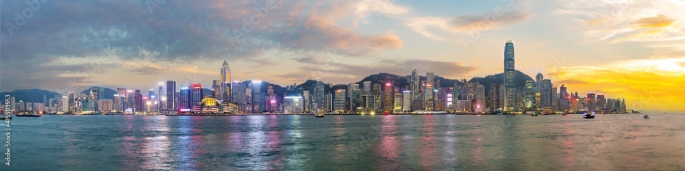 Fototapeta Panorama view of Hong Kong skyline on the evening seen from Kowloon, Hong Kong, China