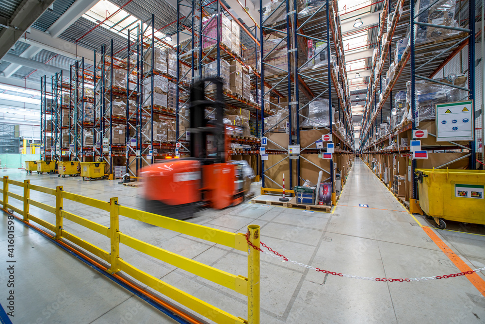 Fototapeta Industrial warehouse for logistics with a folklift in action among the huge shel