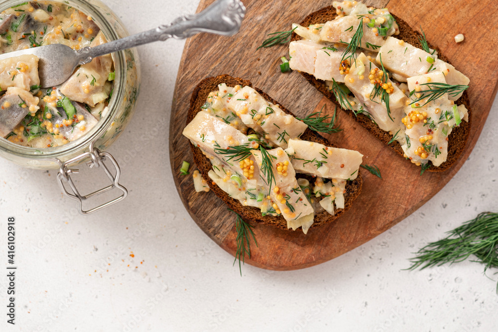 Fototapeta Sandwich with rye bread and pickled herring