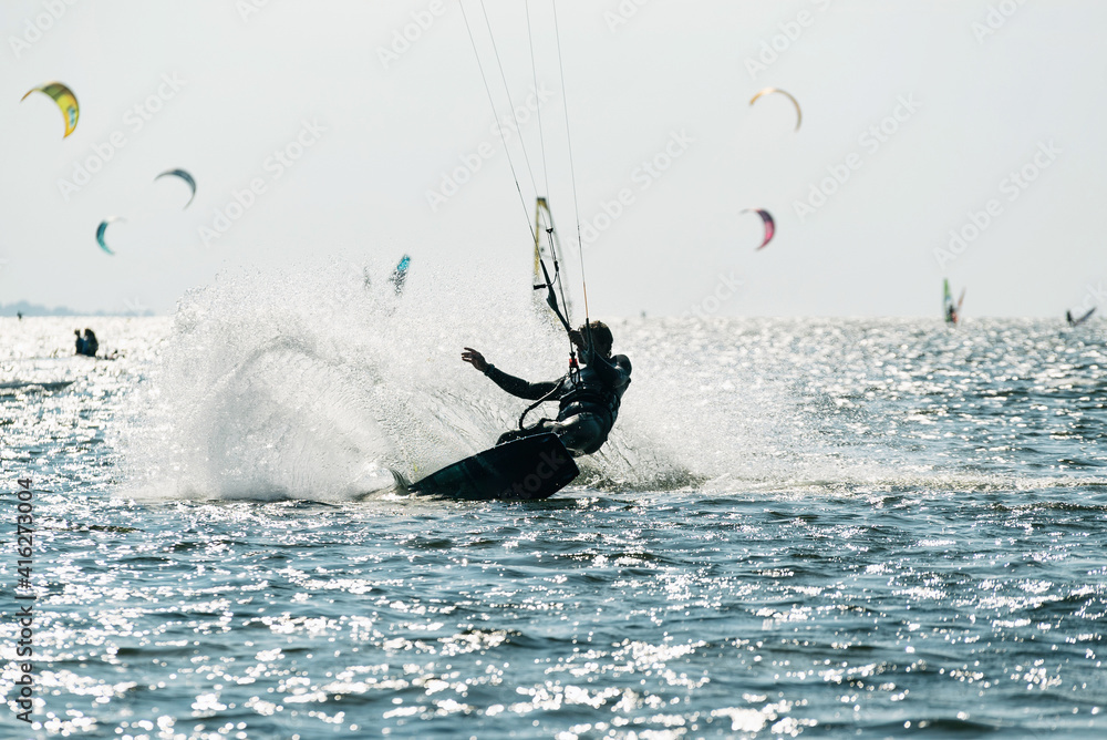 Fototapeta People swim in the sea on a kiteboard or kitesurfing