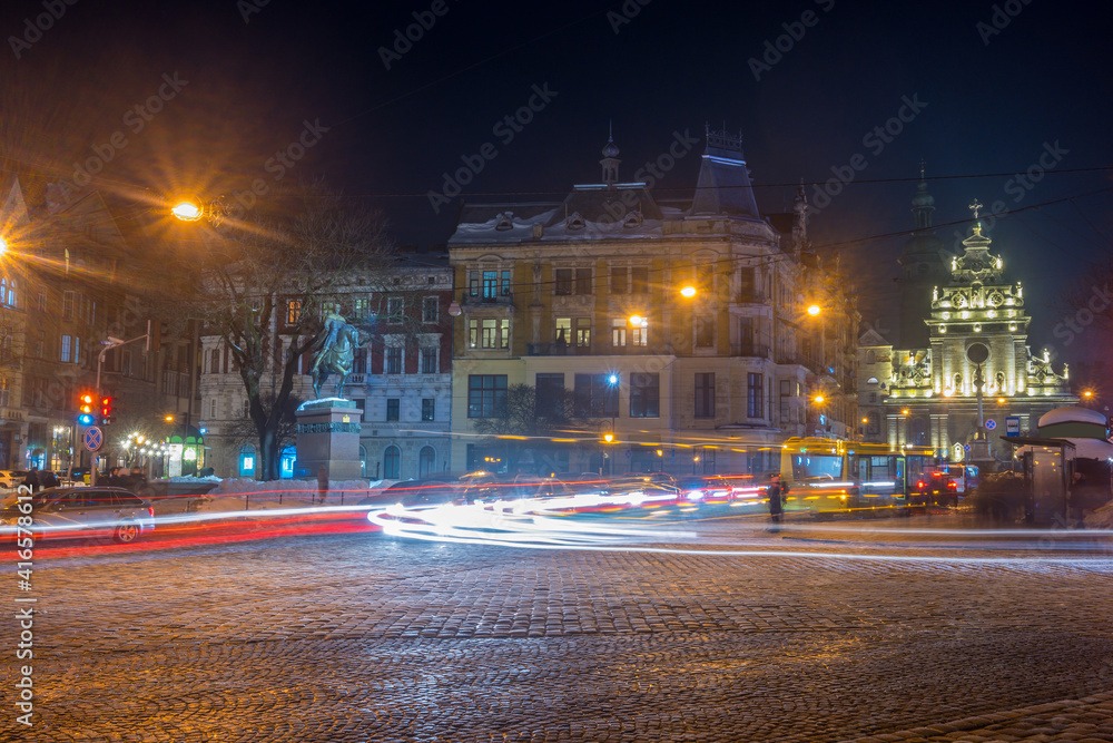 Fototapeta Night Lviv old city architecture in the winter season