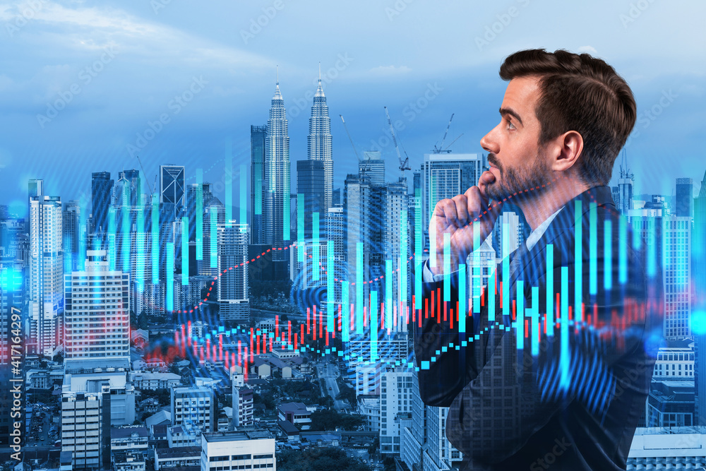 Fototapeta A young Caucasian handsome trader and stock market analyst in suit dreaming about market behavior and forecast in crisis