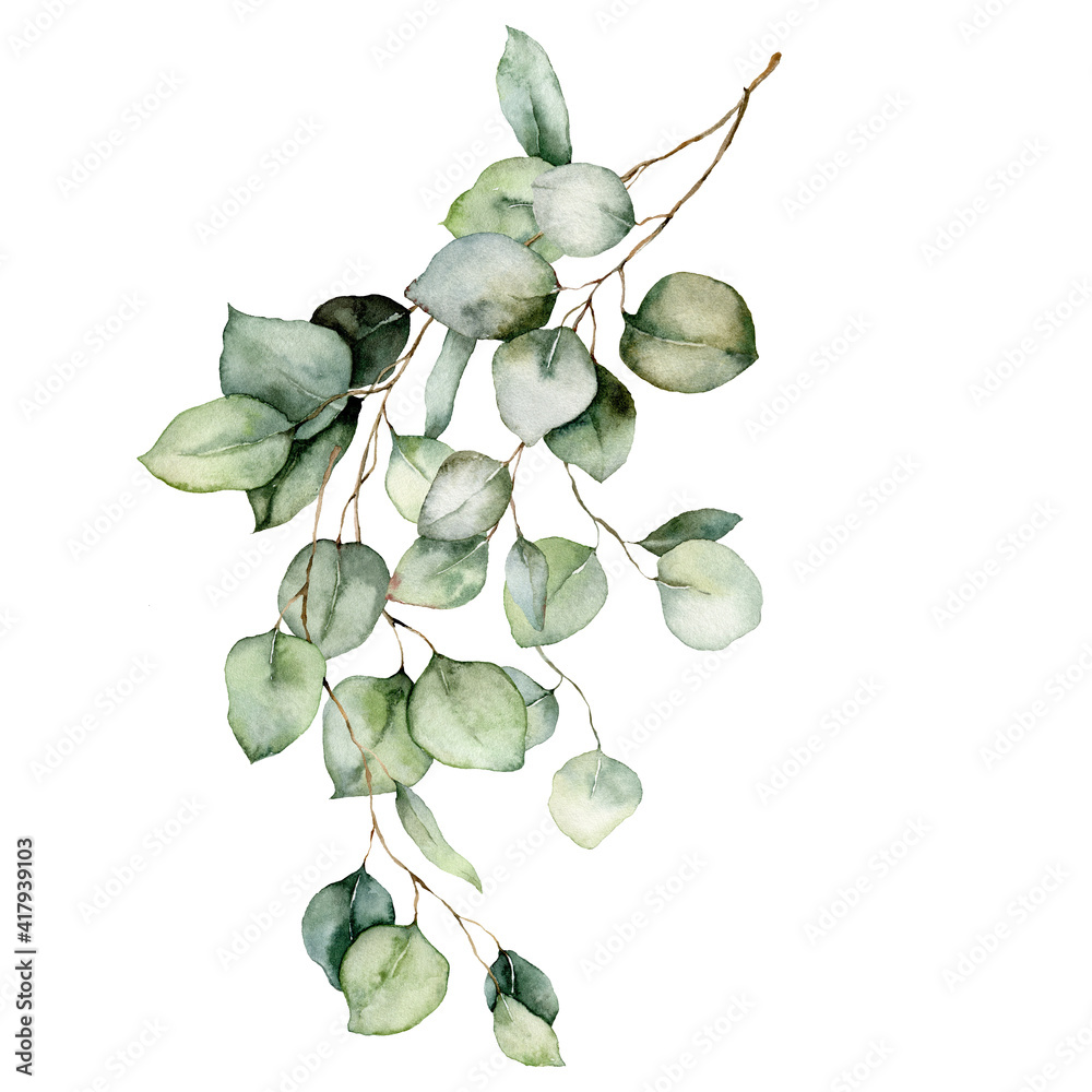 Fototapeta Watercolor card of eucalyptus branches, seeds and leaves