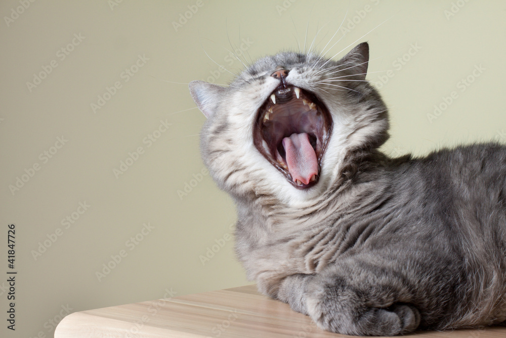 Fototapeta Cat yawning with mouth wide open and shows fangs