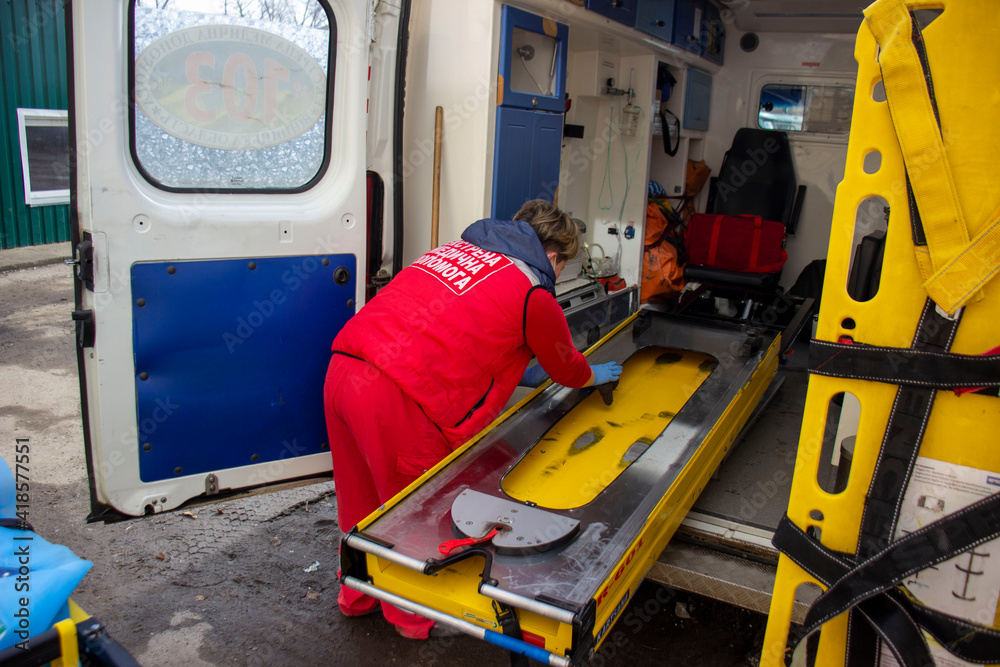Fototapeta Cleaning the ambulance after the call. 06.03.2021 Kyiv. Ukraine