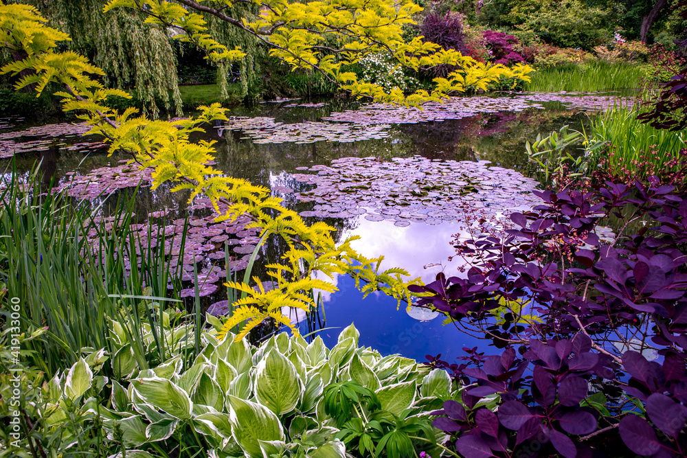 Fototapeta Pond, trees, and waterlilies in a french garden