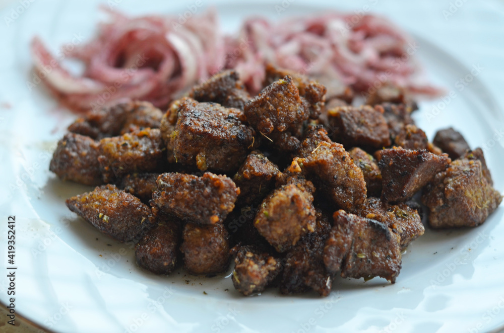 Fototapeta Pan fried beef liver with seasoned onion salad