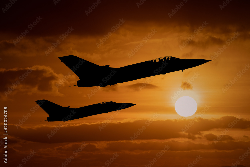 Fototapeta Fighter jets silhouettes at sunset, interceptor military aircraft on a combat mission to intercept foreign aeroplanes
