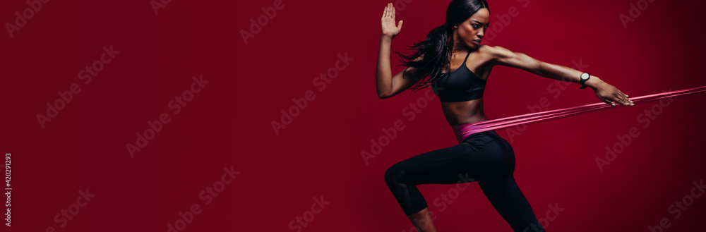 Fototapeta Strong woman exercising with a resistance band