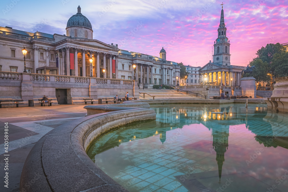 Fototapeta A vibrant colourful, dramatic sunrise or sunset sky at Trafalgar Square and the National Gallery in central London, UK