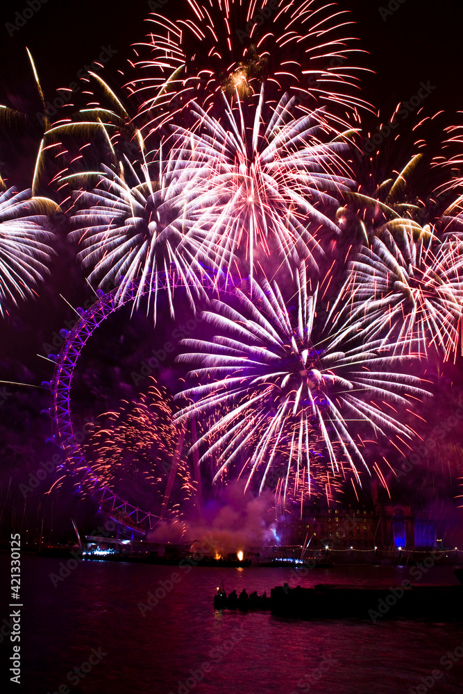 Fototapeta festive New Year fireworks by the River Thames in London.