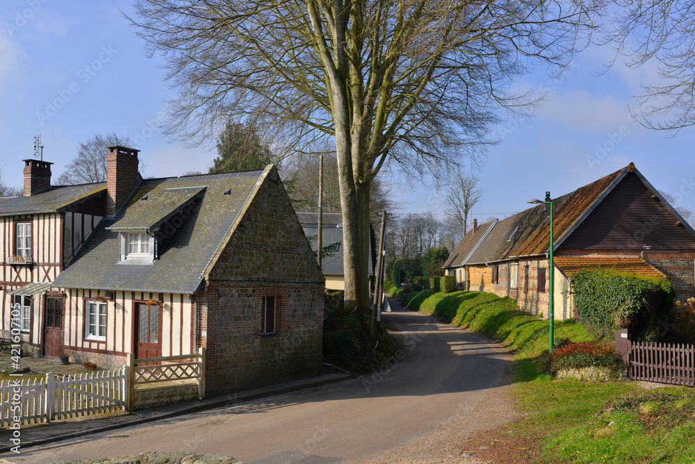 Fototapeta Rue de la Mairie entre les maisons normandes de La Chapelle-sur-Dun (76740), dép