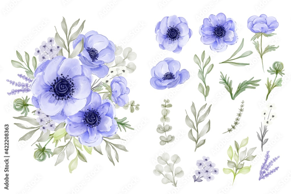Fototapeta isolated elegant purple anemone flower leaves collection