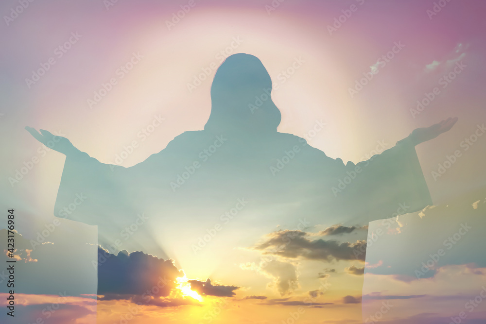 Fototapeta Silhouette of Jesus Christ and cloudy sky, double exposure
