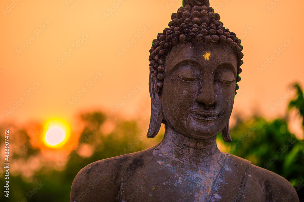 Fototapeta Background of old Buddha statues in Thai religious attractions in Ayutthaya Province, allowing tourists to study their history and take public photos