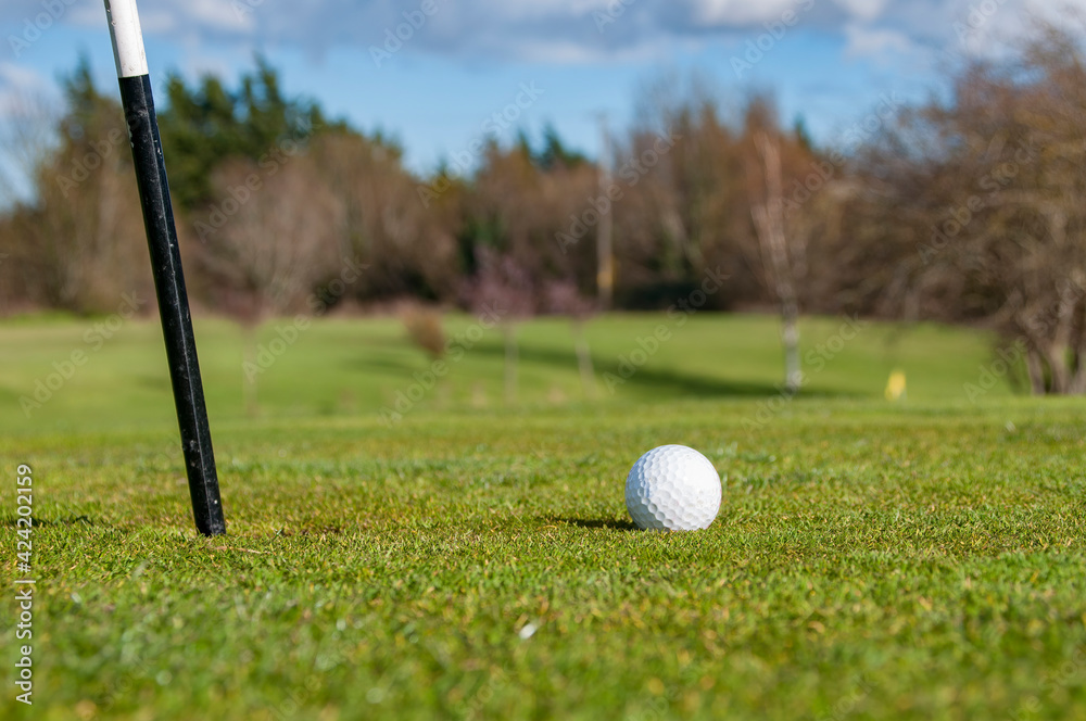 Fototapeta Closeup of Golf Ball beside flagstick.