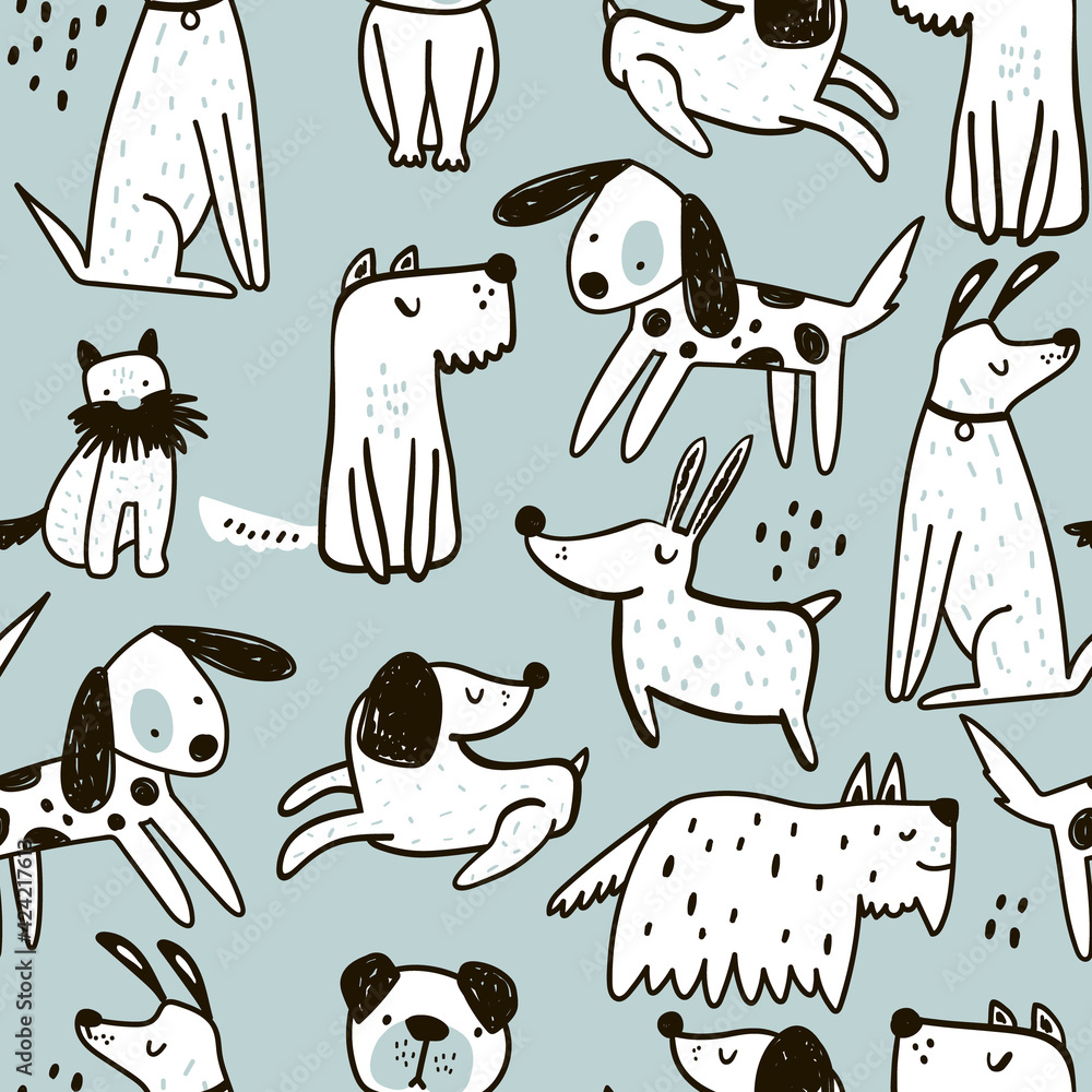 Fototapeta Seamless pattern with cute hand drawn dogs