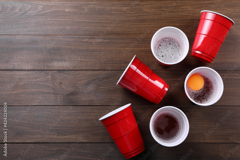 Fototapeta Plastic cups and ball on wooden table, flat lay with space for text