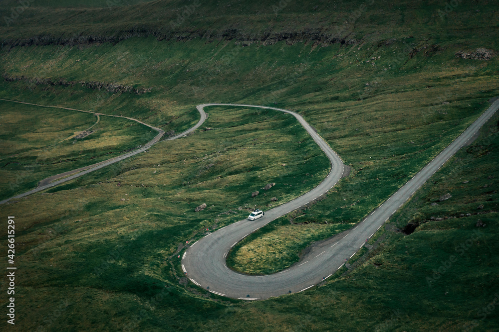 Fototapeta White campervan on a scenic winding pass road in grassland on Faroe Islands