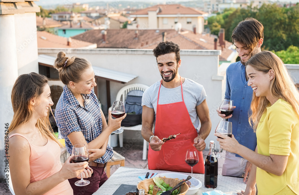 Fototapeta Happy friends eating and drinking wine together at barbecue party outdoors - Mai