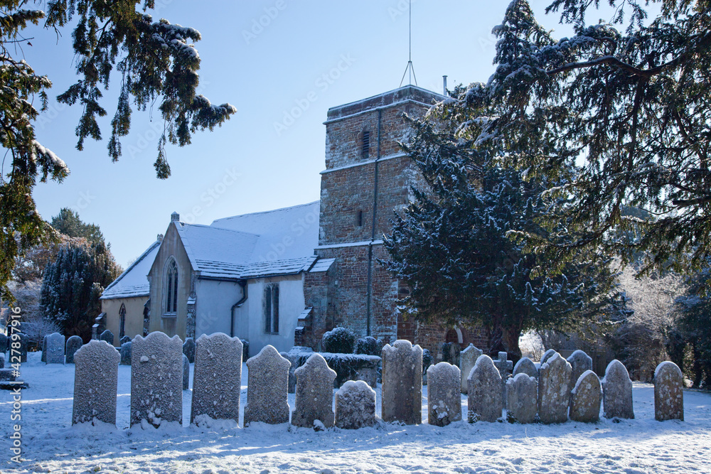 Fototapeta An old church and row of gravestones in the snow