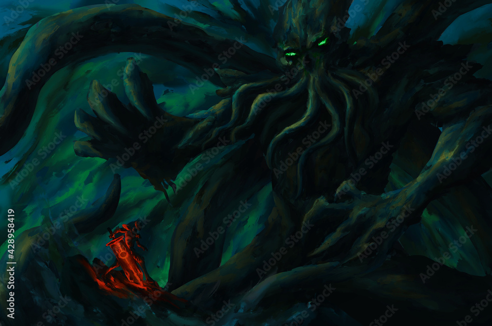 Fototapeta warrior holding blaze sword standing looking Cthulhu,Cosmic monster, sea monster,strom bad weather ,digital art, Illustration painting