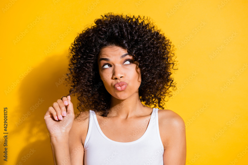 Fototapeta Portrait of adorable dark skin lady arm fingers play with hair curls look empty