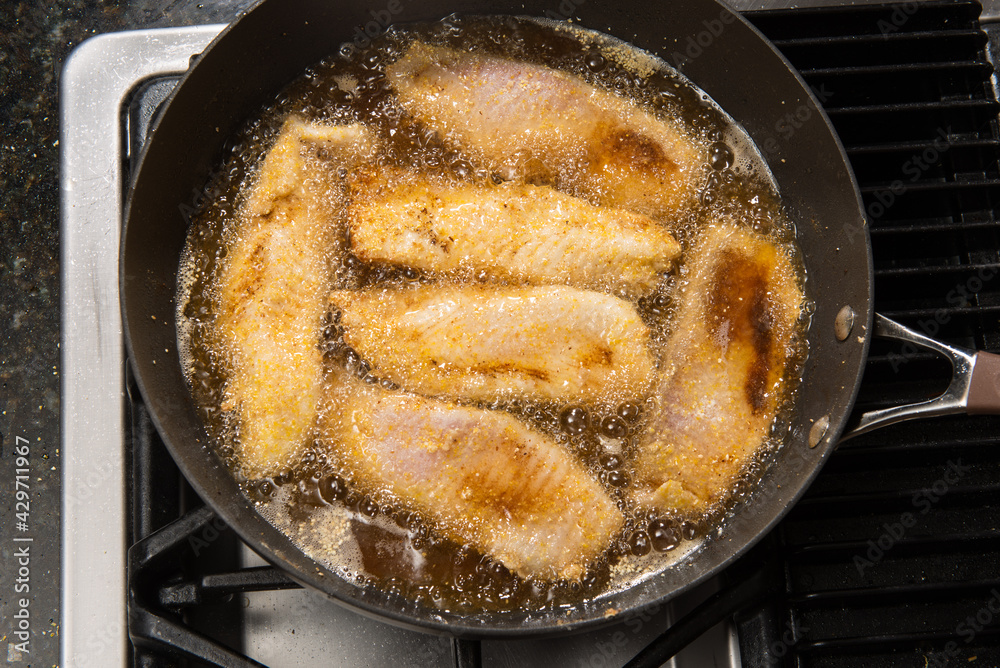 Fototapeta Pan-frying or home cooking fish fillet on a stove top.