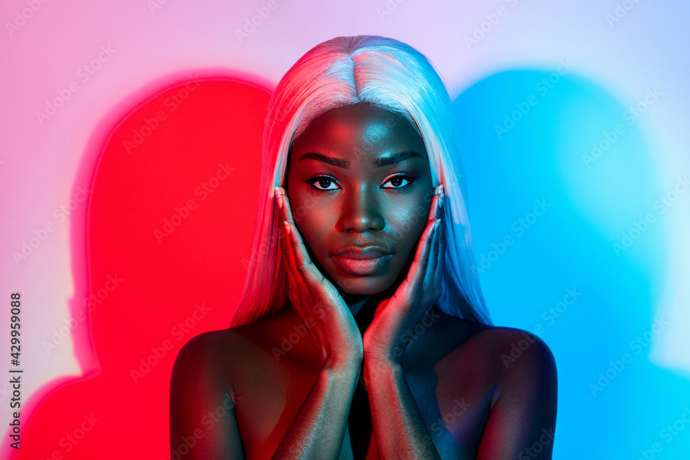Fototapeta Photo of young beautiful stunning african woman touching cheeks wear artificial
