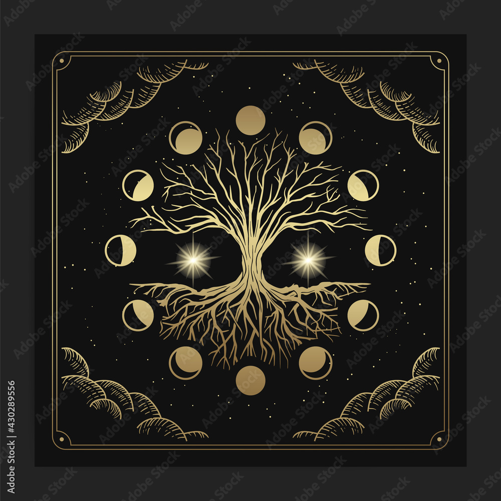 Fototapeta Magical sacred tree in moon phase decoration with engraving, hand drawn, luxury,
