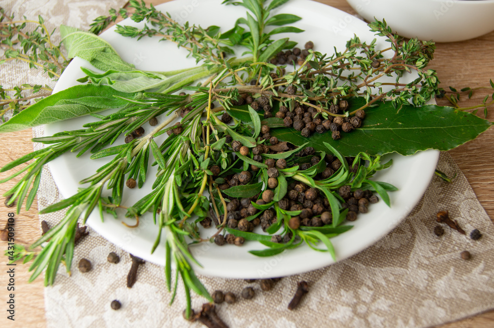 Fototapeta Herbes de Provence and spices on a white porcelain plate.
