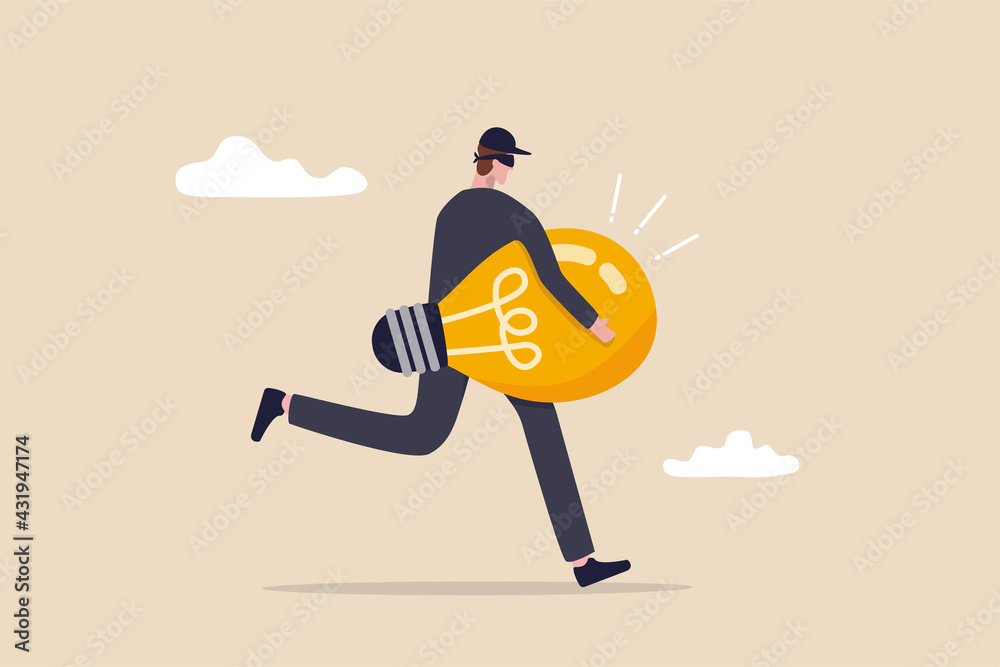 Fototapeta Stealing idea or plagiarism, piracy on intellectual property or infringement concept, thief man in black running with light bulb idea steal from other owner