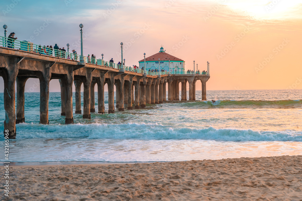 Fototapeta Manhattan beach pier at sunset, orange-pink sky with bright colors, beautiful la